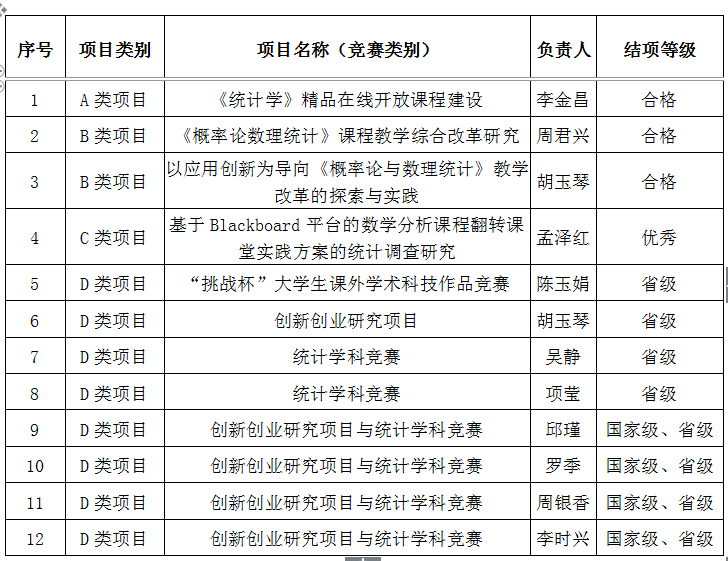 根据《关于办理浙江省一流学科A类(禁漫岛 统计学)2016年教学建设项目结项事宜的通知》的规定,按照公开、公平、公正的原则,经过学院教学委员会评审,12项规划项目课题(其中A类项目1项,B类项目2项,C类项目1项,D类项目8项)准予结项,现予公布。