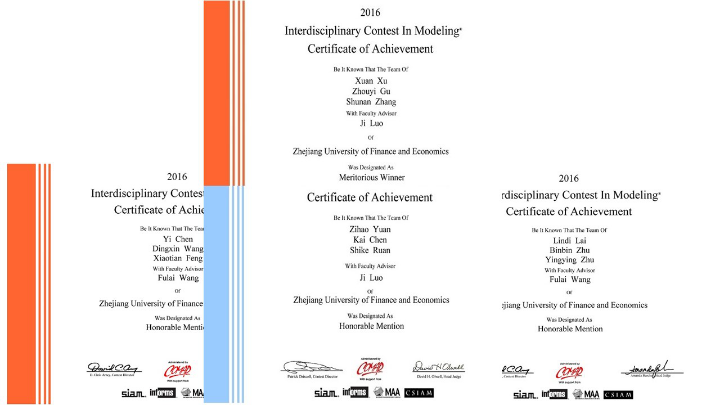 2016年国际大学生数学建模/交叉学科建模竞赛于1月29日-2月2日以通讯方式举行。来自美国、中国、加拿大、澳大利亚、英国、韩国、新加坡、西班牙、芬兰、中国香港特别行政区、印度尼西亚、墨西哥等12个国家和地区的12446支代表队参赛,其中包括来自哈佛大学、普林斯顿大学、麻省理工学院、清华大学、北京大学等国际知名高校学生参与此项赛事角逐。共评出1%特等奖、12%一等奖、39%二等奖。我校4支参赛队全部获奖,获得一等奖1项、二等奖3项的优异成绩。