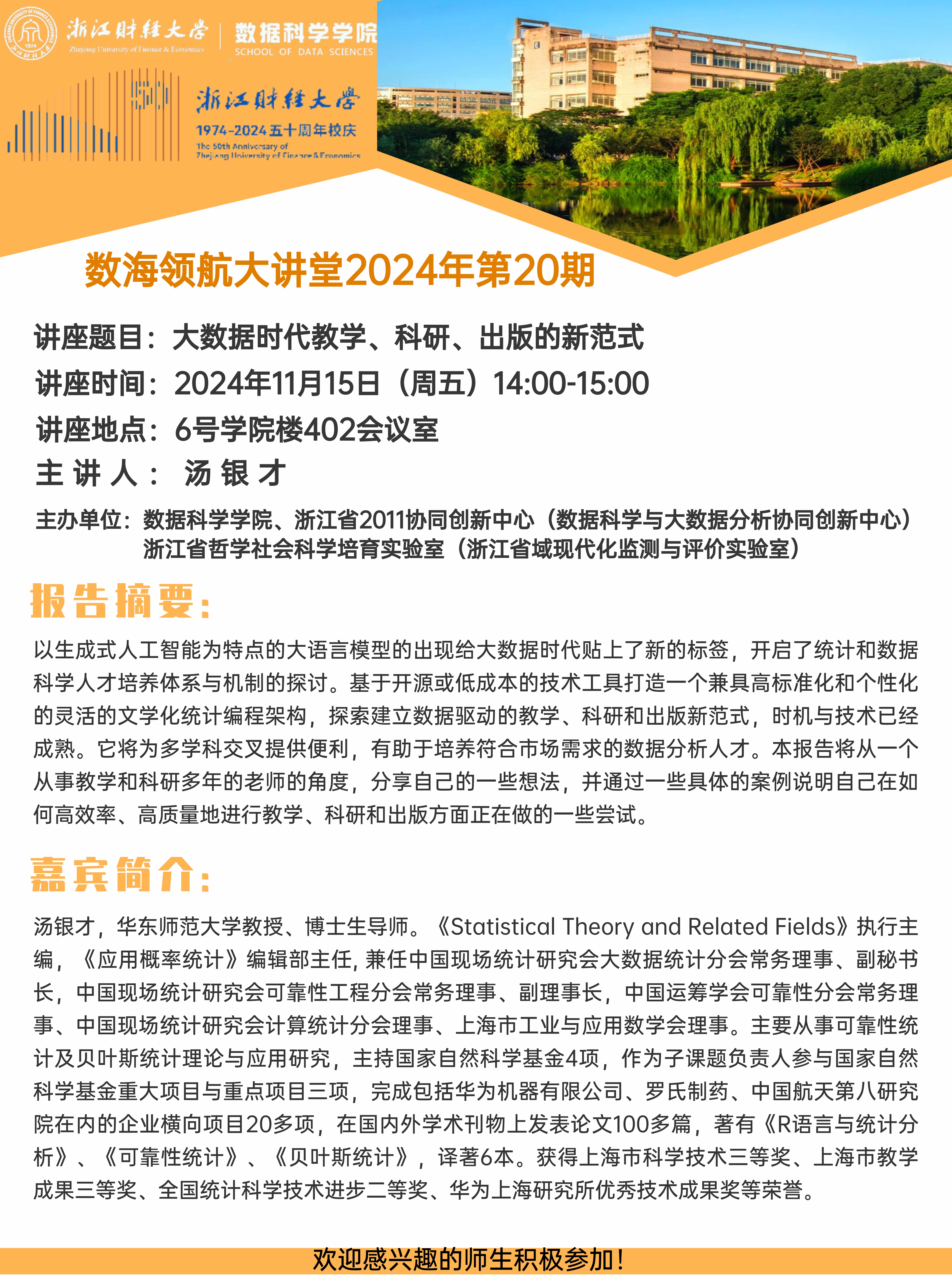 上一条:数海领航大讲堂2024年第21期——北京工业大学薛留根教授 下一条:数海领航大讲堂2024年第19期——西北农林科技大学傅隆生教授