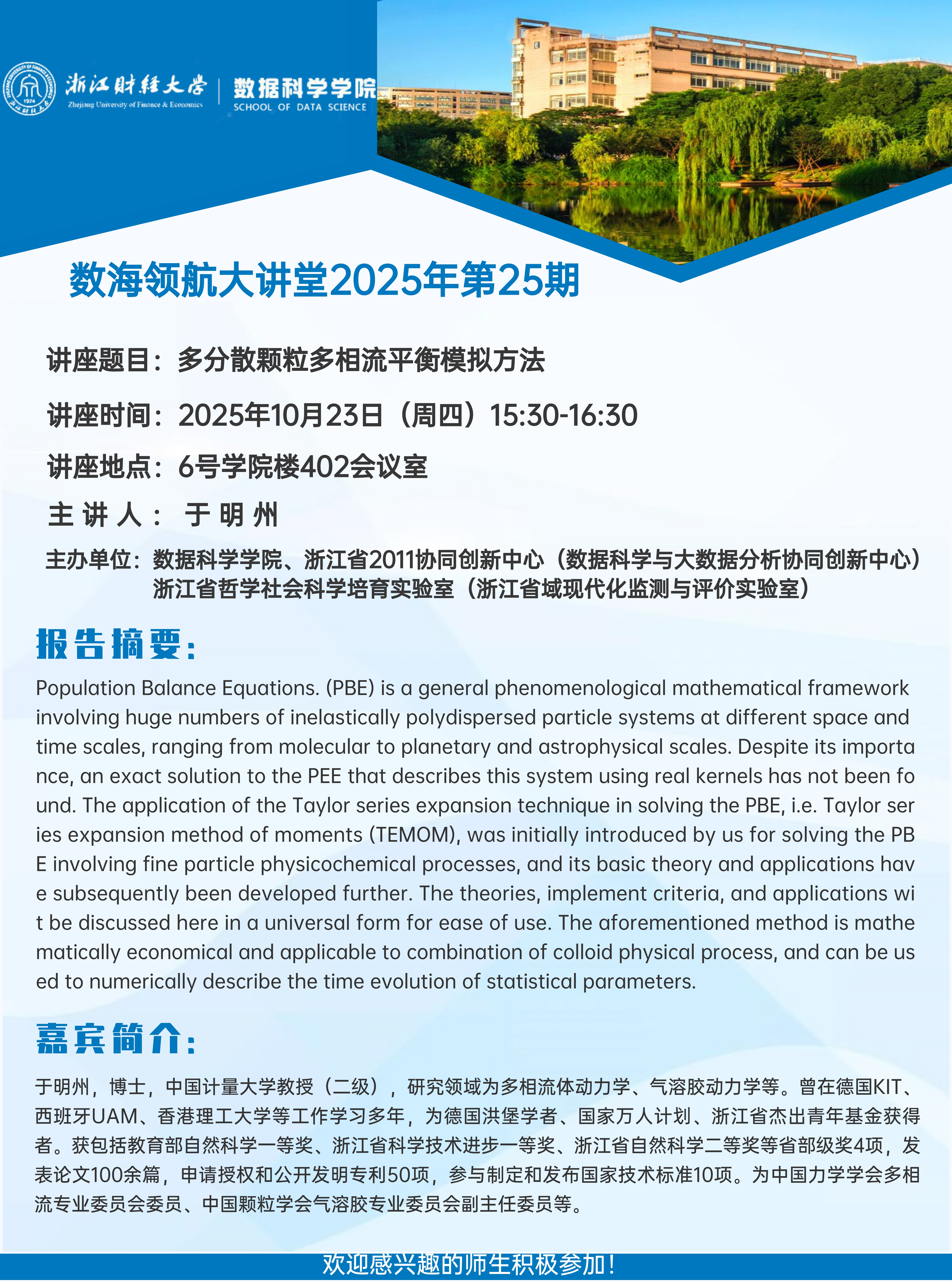 上一条:A dynamical system view of p53 dynamics triggered by DNA damage——数海领航大讲堂2025年第23期开讲 下一条:数海领航大讲堂2025年第24期——杭州电子科技大学孙伟刚教授