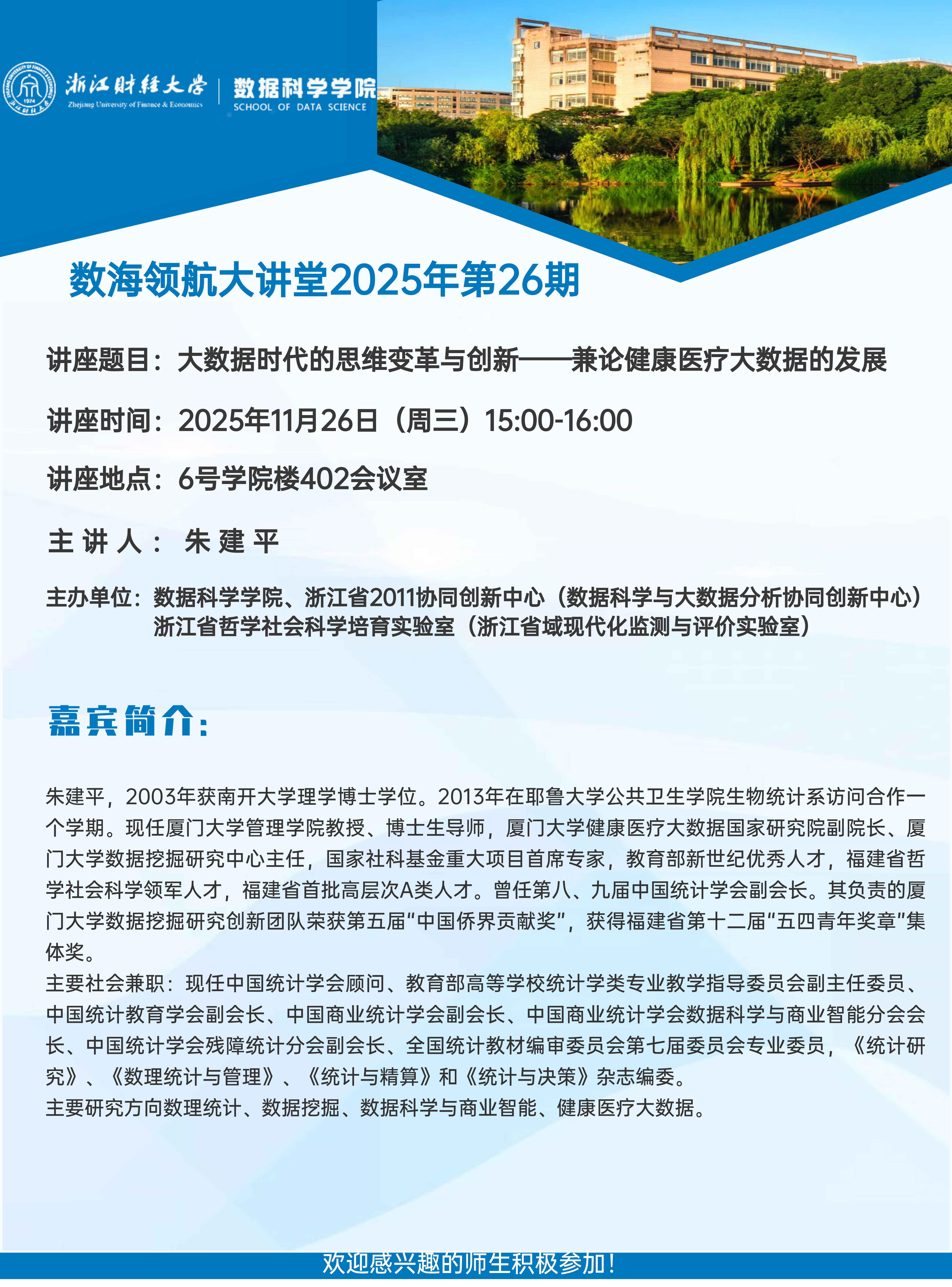 上一条:大数据时代的思维变革与创新——兼论健康医疗大数据的发展 ——数海领航大讲堂2025年第26期开讲 下一条:第三届统计学与数据科学高质量发展论坛在我校举行