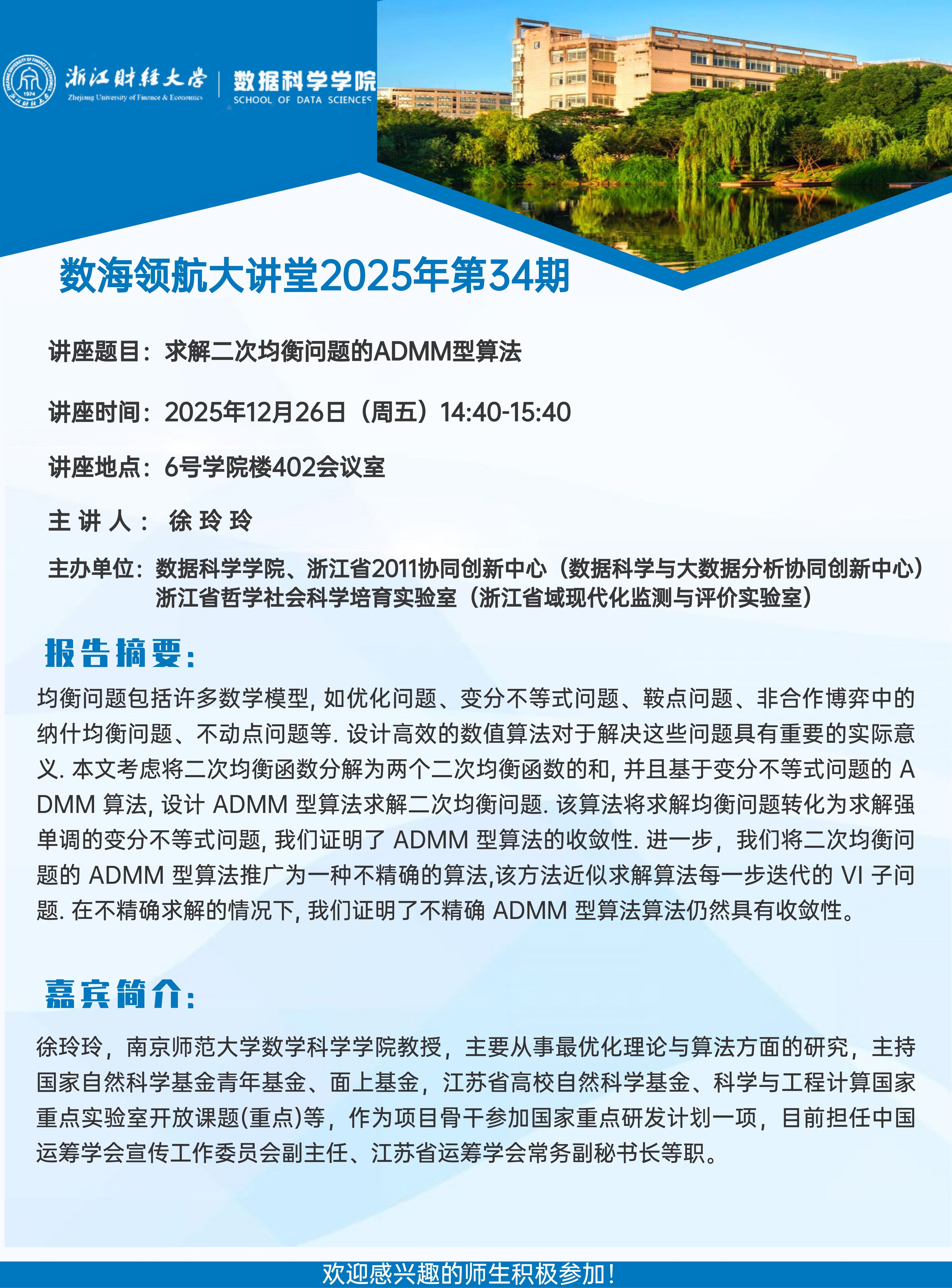 上一条:巴黎综合理工学院(ENSAE/CREST)统计系助理教授Austin J. Stromme 应邀来禁漫岛 讲学 下一条:数海领航大讲堂2025年第33期——南京大学杨俊锋教授