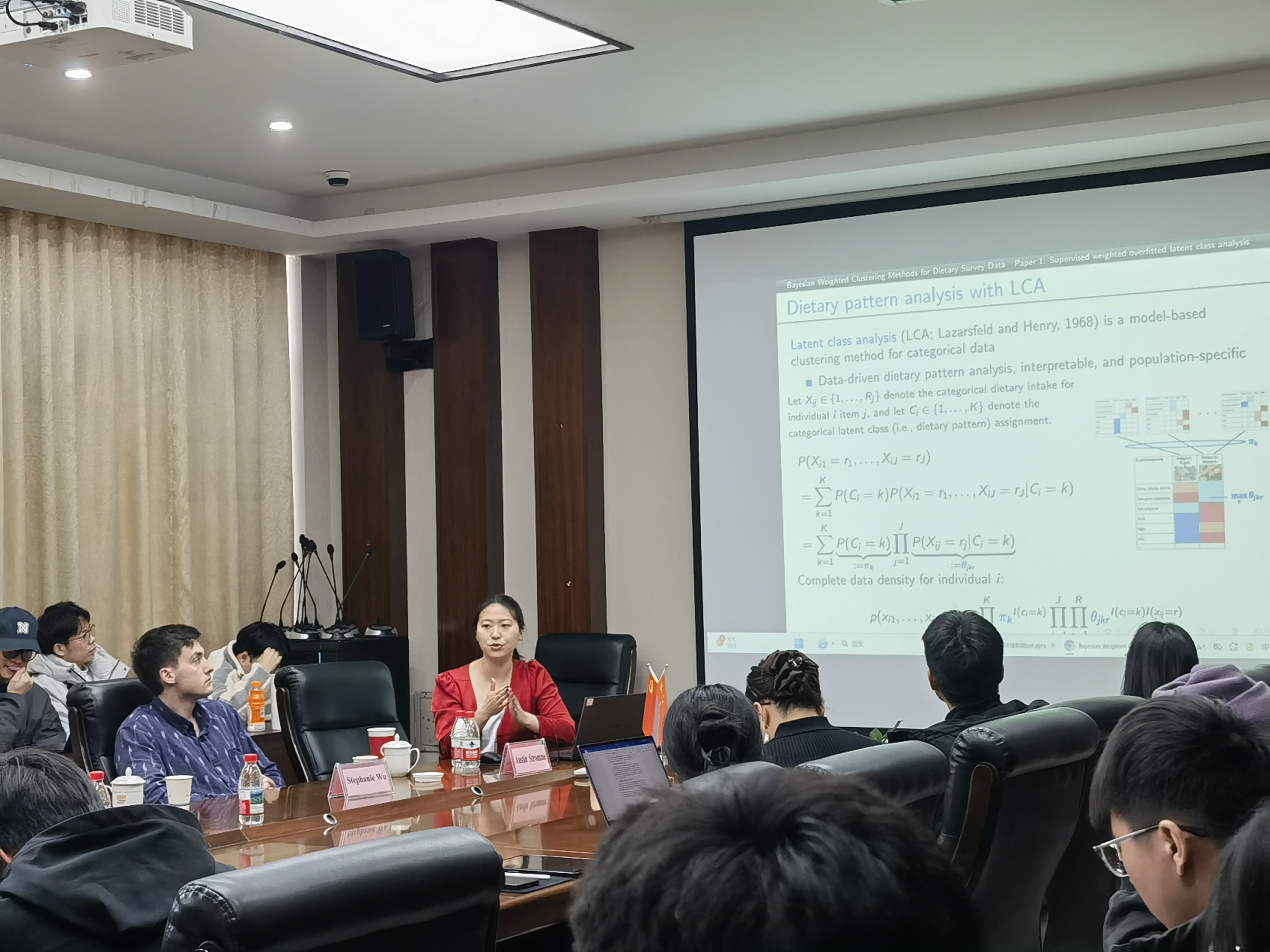 首先,Stephanie从人口健康研究的核心数据基础切入,指出调查数据在其中扮演着至关重要的角色,但其复杂的抽样设计、高维特性以及变量间的相互关联也带来了巨大的统计分析挑战。本研究旨在解决这些挑战,提升从复杂调查数据中推断总体规律的可靠性与公平性。随后,Stephanie 提出了本工作的核心方法论贡献:发展了一套贝叶斯建模框架,该框架扩展了经典的聚类方法,使其能够同时兼容处理复杂概率抽样设计与非概率抽样数据。通过引入伪似然框架,所提出的方法能够有效校正样本选择偏差,并完全传递抽样与模型的不确定性,从而显著提升了统计推断的可推广性与准确性。然后,Stephanie具体阐述了方法的理论基础与实现机制。在伪似然的构建中,研究通过整合调查权重与设计信息,将抽样机制自然地纳入贝叶斯生成模型。这种设计确保了在进行潜在人群亚组识别及其与健康结局关联分析时,所有推断步骤均能充分反映原始调查设计的复杂性,并实现不确定性从数据到结论的完整传播。进一步,Stephanie强调了该方法的通用性与理论价值。虽然研究最初受营养流行病学实际应用的驱动,但所发展的贝叶斯建模途径具有高度的灵活性,可广泛适用于心理健康研究等其他公共卫生乃至社会科学领域,为解决各类复杂调查数据的分析难题提供了统一、严谨的统计工具。Stephanie指出,本次报告的工作与传统忽略调查设计的聚类分析或机器学习模型有根本不同。它将抽样设计的考量深度嵌入贝叶斯生成模型的核心,为在“大数据”时代科学、公平地利用具有复杂结构的调查数据,创造了一个新的方法论范式。