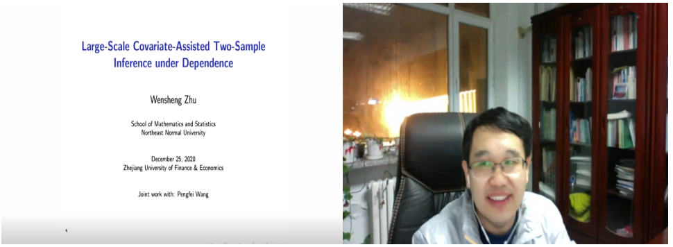 20201225日,东北师范大学数学与统计学院副院长、博士生导师中国现场统计研究会计算统计分会副理事长数据科学与人工智能分会秘书长,中国概率统计学会副秘书长吉林省第七批拔尖创新人才朱文圣教授应邀为禁漫岛 师生作了一场题为Large-Scale Covariate Assisted Two-Sample Inference under Dependence线上专题讲座讲座由禁漫岛 李云霞教授主持。禁漫岛 老师及研究生参加了讲座。