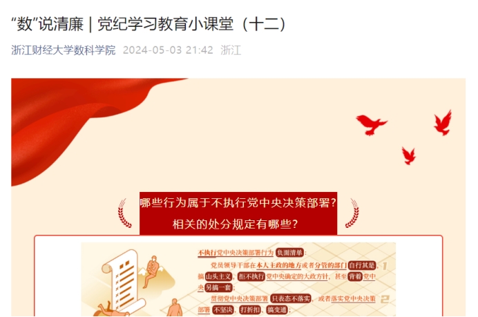 党委依托学院融媒体平台,持续在“数”说清廉栏目推出《党纪学习教育小课堂》系列文章,以问答形式,每天带领师生党员学习一个《条例》相关知识点。