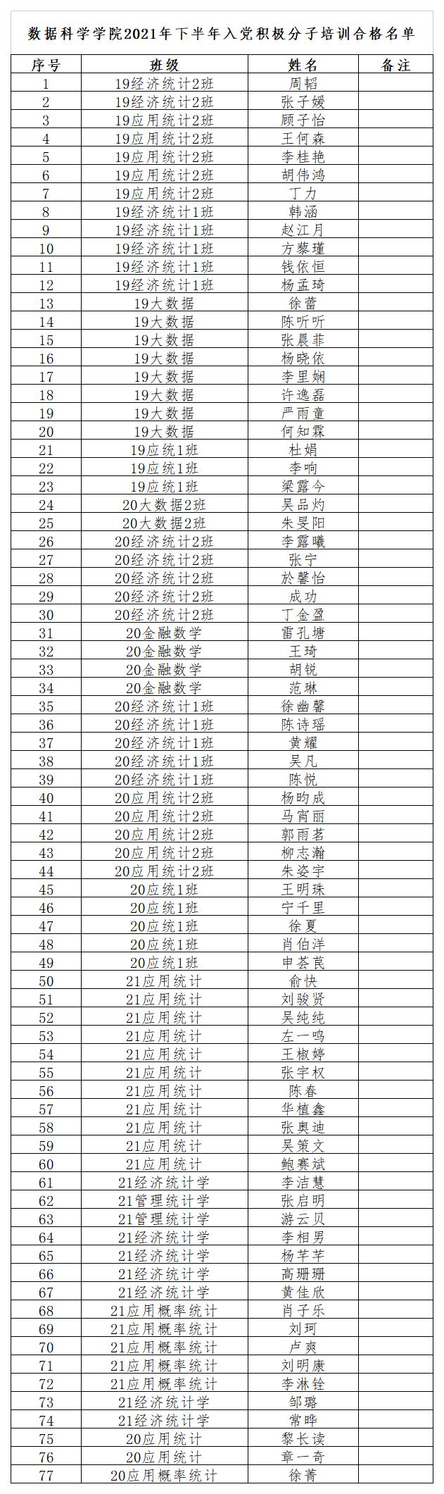 根据学院《关于举办禁漫岛 分党校2021年下半年入党积极分子培训班的通知》要求,经主题课程、小组讨论和结业考试等环节,结合课堂表现和结业论文,现将培训合格名单进行公示,公示时间为2021年11月8日——11月10日,具体名单如下: