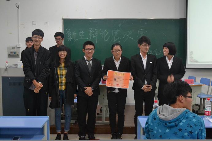 大赛继续进行,进入自由辩论环节,辩手们清晰的思路和巧妙的陈词给观众留下了深刻印象。接着经过短暂的观众提问环节之后,评委们对本次辩论赛做了精彩的点评。然而最激动人心的当然是公布比赛结果。最终,反方辩手刘佳萍、陈建豪、吴文截、朱皓正同学赢得了本次新生辩论赛的冠军。