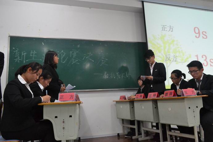 举办了2014级新生辩论赛的决赛。裁判由校辩论队资深辩手数统学院俞露、数统学院何飞彦、会计学院郭诚豪、金融学院沈柯儿、法学院吕烨恒等五人组成。参加决赛选手由大一各个班级的学生构成,他们一路过关斩将,这次也是向着最后的冠军发起奋力的冲击。