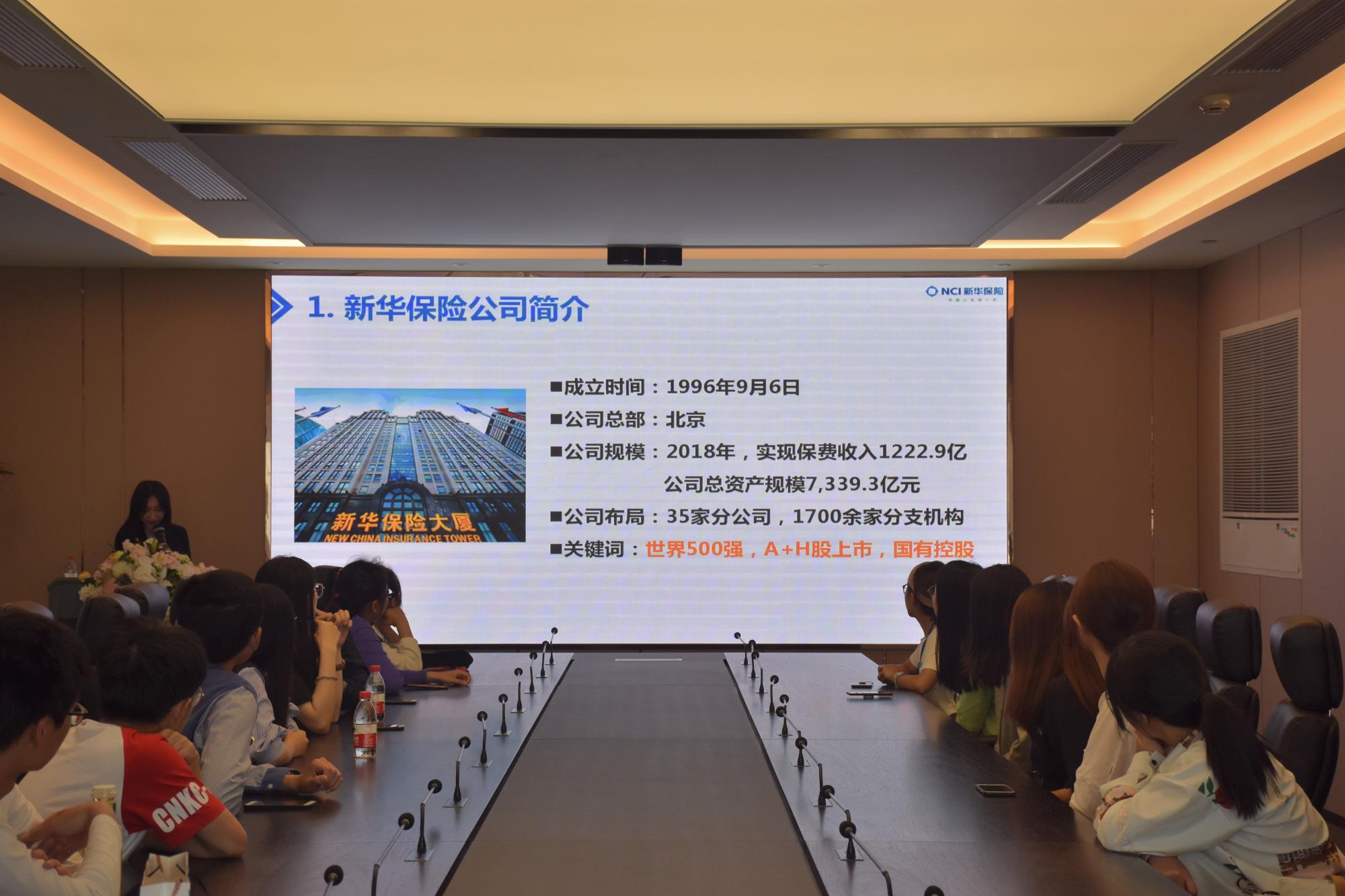 老师和前来参观的学子,新华保险干部管理室经理陈亦宁简要介绍了新华保险的独特之处与校园暑期招聘情况等事宜,与在场学生就参加新华保险企业开放日的理由与目的展开了亲切互动,并就这一话题着重为同学介绍了在新华实习的体验与2019年暑期实习安排。