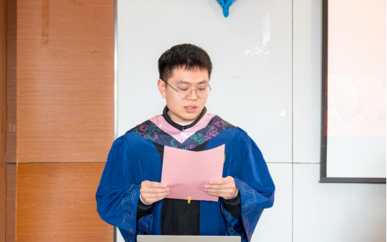 毕业生代表赵宇辉同学代表全体毕业生作表态发言,号召全体毕业生牢记母校谆谆教诲和殷切希望,祝愿学院蓬勃发展、再攀高峰。