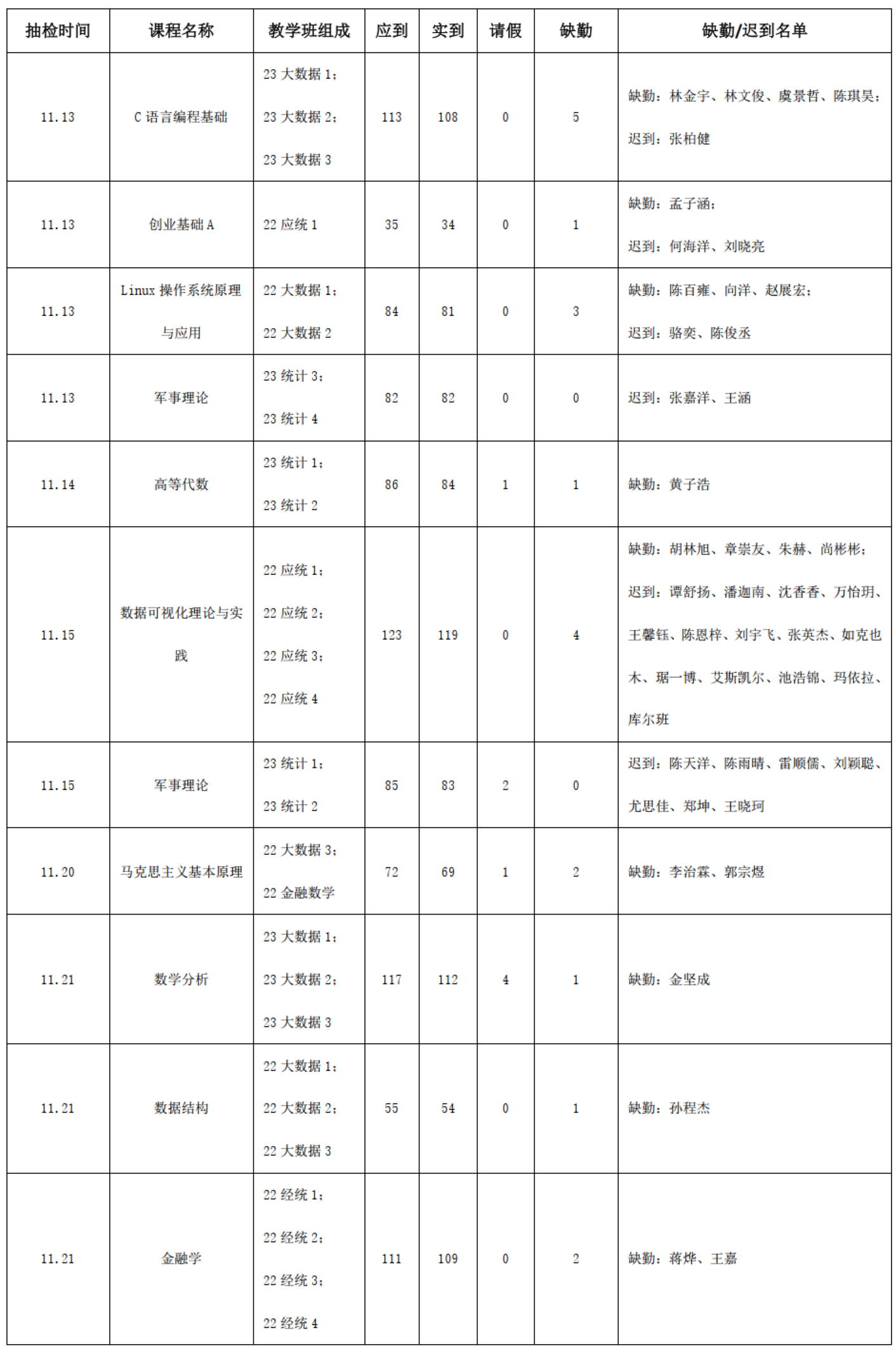 为进一步加强学院学风建设,贯彻落实任课教师、辅导员和学生会三线考勤的督学制度,现将学院第十周、第十一周课程考勤抽检情况通报如下: