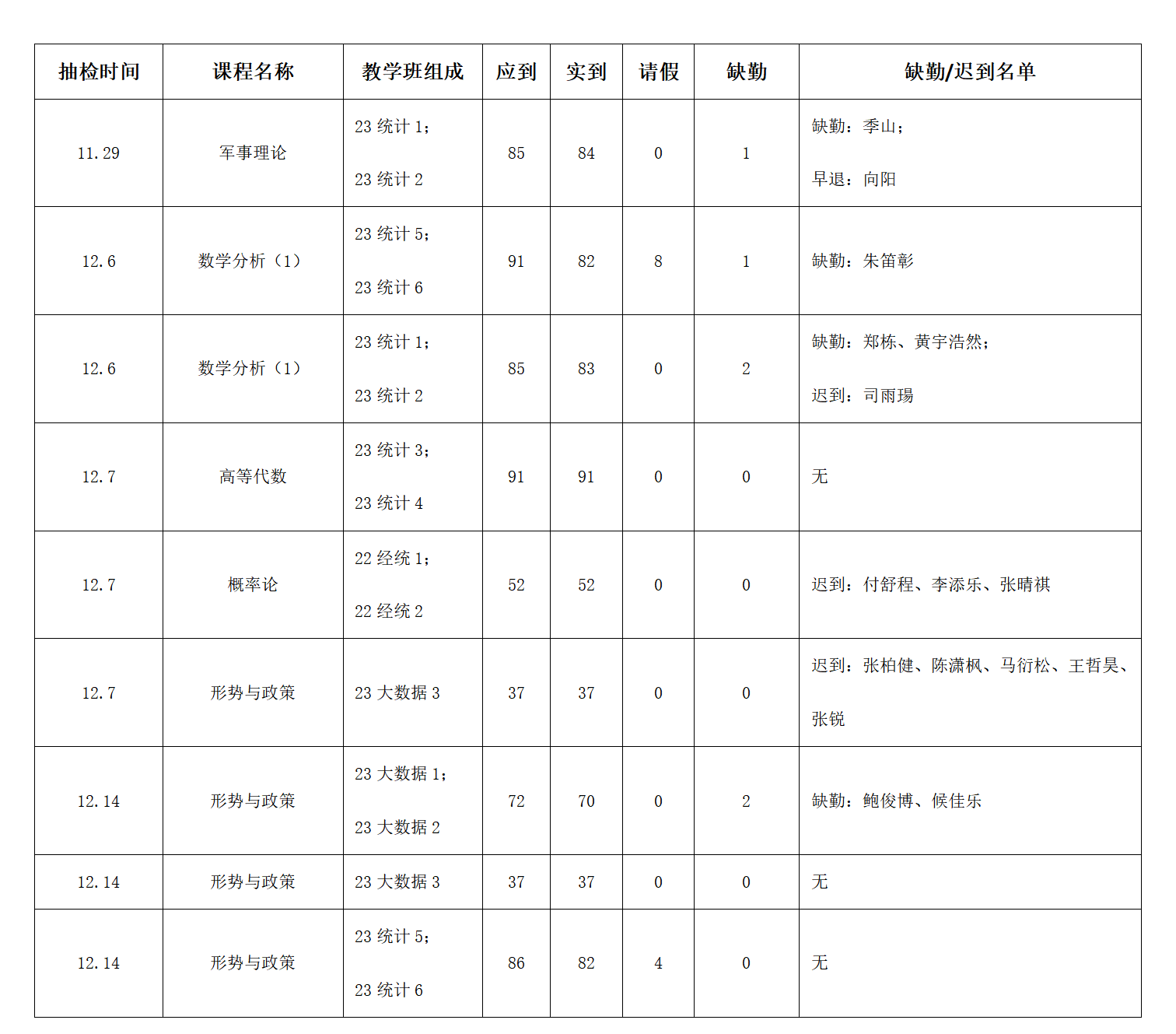 为进一步加强学院学风建设,贯彻落实任课教师、辅导员和学生会三线考勤的督学制度,现将学院第十二周、第十三周、第十四周课程考勤抽检情况通报如下: