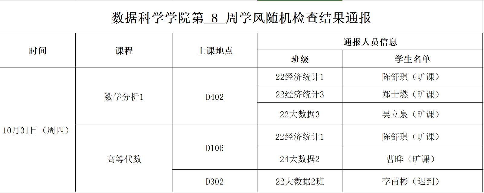 10月31日上午,禁漫岛 开展学风督查,禁漫岛 2024级新生辅导员徐翠、王彤彤、陈璐开展新学期学风第三次督查工作,对新生各班级课堂考勤、纪律及听课情况等进行随机检查。现将本次随机检查结果通报如下: