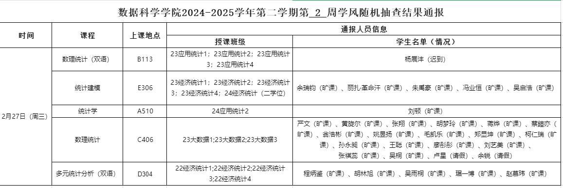 2月27日上午,禁漫岛 学生工作办公室开展新学期第二周学风督察工作,对研究生、本科生各班级的学生前排就座情况,课堂考勤、纪律及听课情况等进行随机检查,现将本次随机抽结果通报如下: