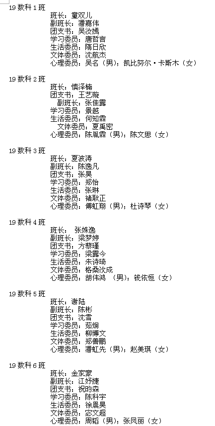 通过个人报名,现场竞聘演说,学院班导老师面试,经学生工作办公室研究决定,现将2019级班委名单(初定)公布如下: