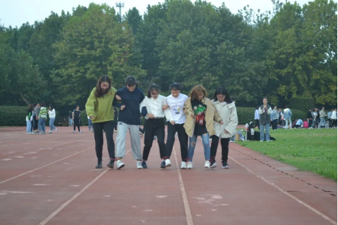 “一二一二……”循着呐喊声便能发现操场西面六人七足的踪影,红绳不仅仅绑紧了双足,更将同学们团结必胜之心紧紧相连在了一起。轻快而有节奏的步伐与有极强节奏的喊声在红色塑胶跑道上构成了一道别样的风景。