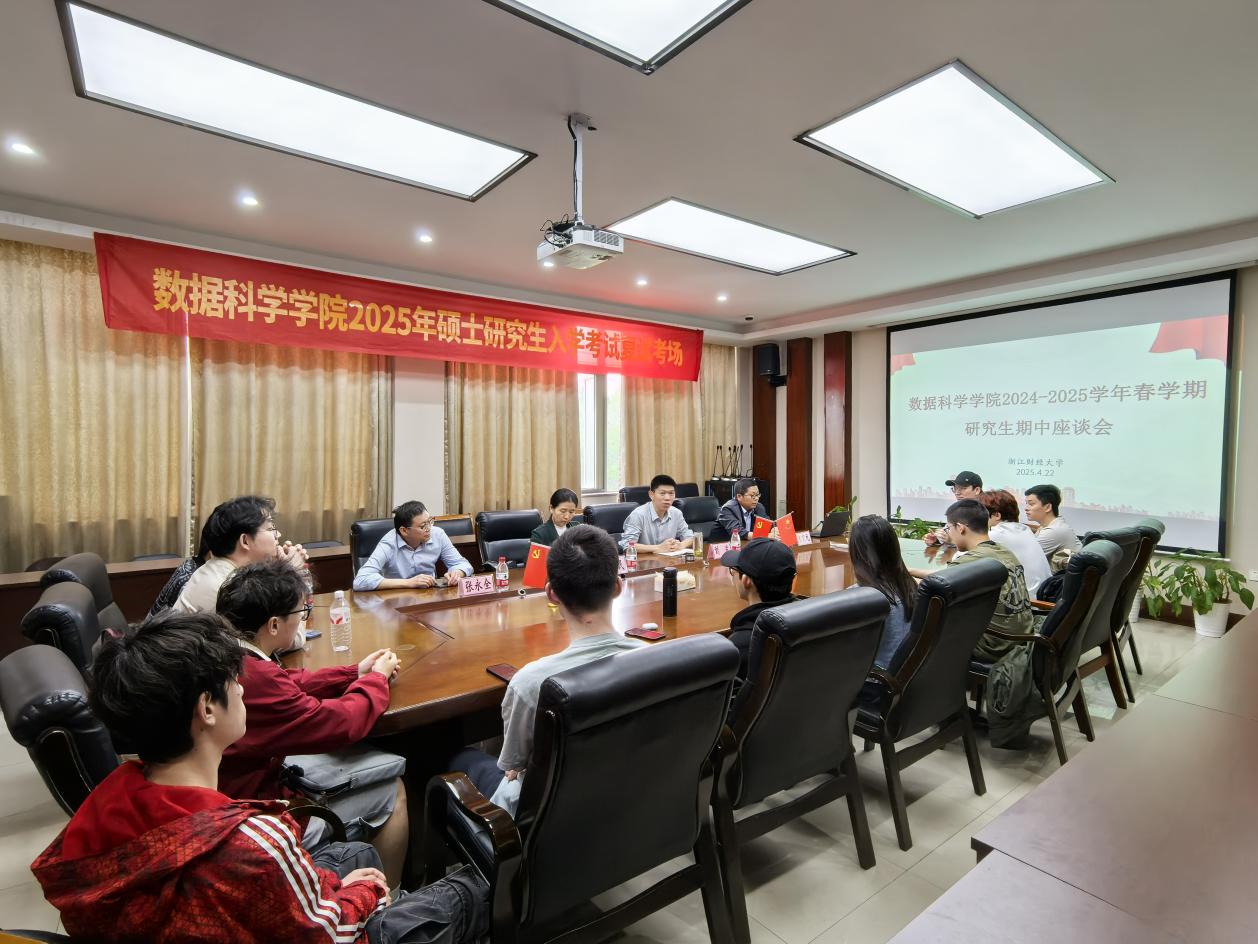 于402会议室举行2024-2025学年春学期研究生期中座谈会。座谈会由副院长刘波主持,校督导组成员吴丽民、学位点负责人代表张永全、朱宗元及研究生代表参加此次座谈会。