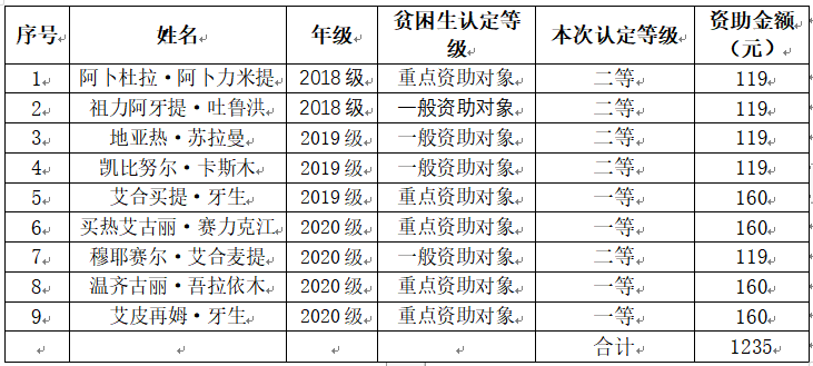根据浙江省教育发展中心《关于做好2020-2021学年内地高校新疆籍学生资助对象工作的通知》文件精神,禁漫岛 共收到划拨经费为1235元。学院按照实事求是的原则,坚持公正、公平、公开,结合学院特色和学生实际情况,确定出资助名额共9个,其中一等4名,二等5名,具体情况见下表。