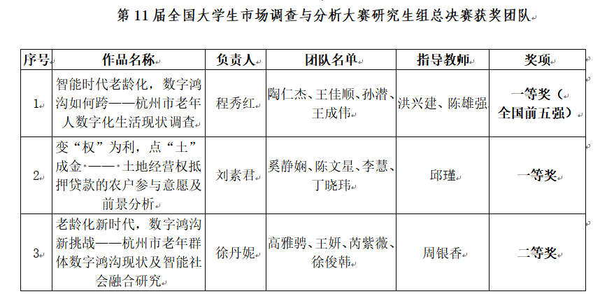 5月15-16日,由教育部高等学校统计学类专业教学指导委员会与中国商业统计学会共同主办,云南大学协办的“第11届全国大学生市场调查与分析大赛研究生组总决赛”在昆明落下帷幕。研究生第一党支部成员程秀红主持智能时代老龄化,数字鸿沟如何跨——杭州市老年人数字化生活现状调查入围全国前五强,荣获一等奖的佳绩党支部成员王妍、芮紫薇参与的老龄化新时代,数字鸿沟新挑战——杭州市老年群体数字鸿沟现状及智能社会融合研究荣获二等奖佳绩。
