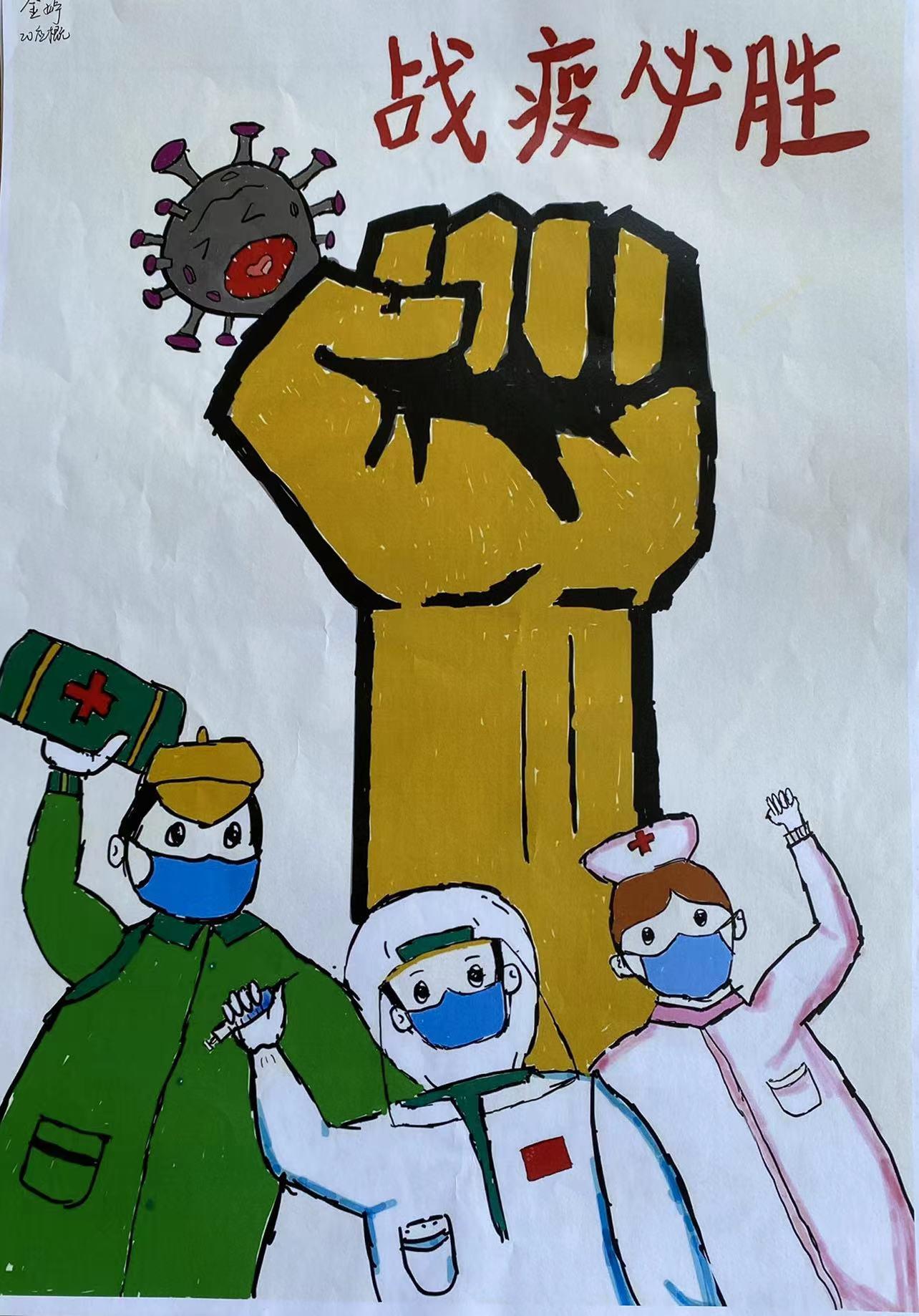 作者研究生第一党支部党员金婷表示:“自新冠疫情暴发以来,一直都是医护人员冲在最前面和病毒斗争,保护我们每一个人,所以想用这幅作品表达对他们的敬佩和感谢之情,希望我们能一起携手迎来摘下口罩随心出行的那一天。”作品里的人物主要指代医护人员和捐助物资、送物资的人,巨大的拳头展现出必胜的姿势,意在我们所有人都会和病毒抗争到底且终将胜利。