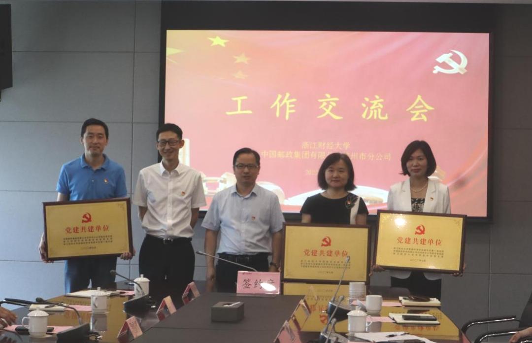 研究生第一党支部与中国邮政集团有限公司杭州市分公司联合党支部签订党建共建协议。楼胆群部长和赵胜平副总经理为党建共建支部授牌。