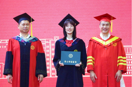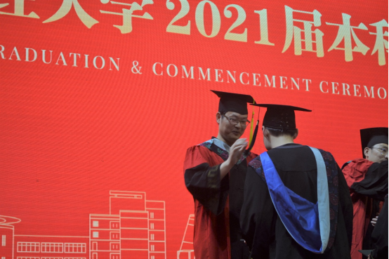 党委书记段雪辉、副院长周银香、副院长李杰及各专业导师为他们颁发学位证书,并拨穗完成仪式,象征大学时光的学习与付出最终收获成长。