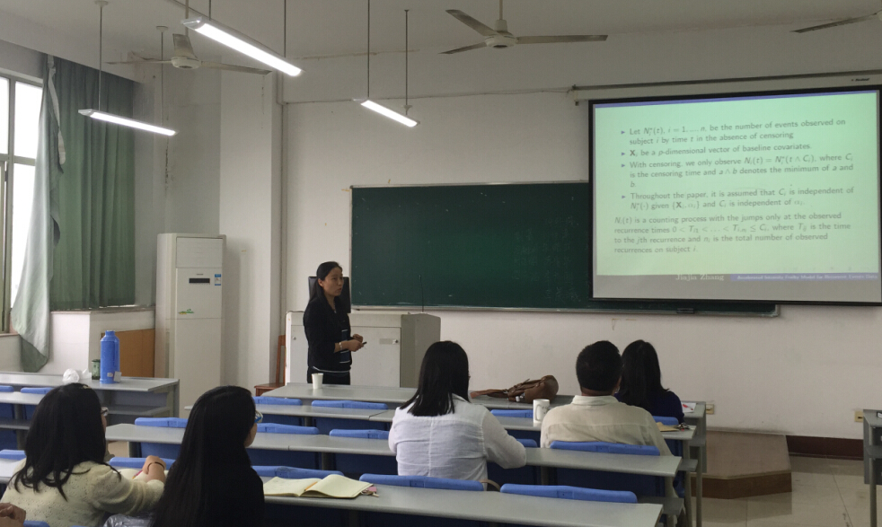 2015年7月6日,美国南卡罗来纳大学张佳佳教授应邀来我校演讲,做了题为“Accelerated Failure Time Intensity Frailty Model for Recurrent Events Data”的专题讲座。数学与统计学院部分老师及全体研究生参加了此次讲座。报告会由数学与统计学院副院长,邱瑾教授主持。